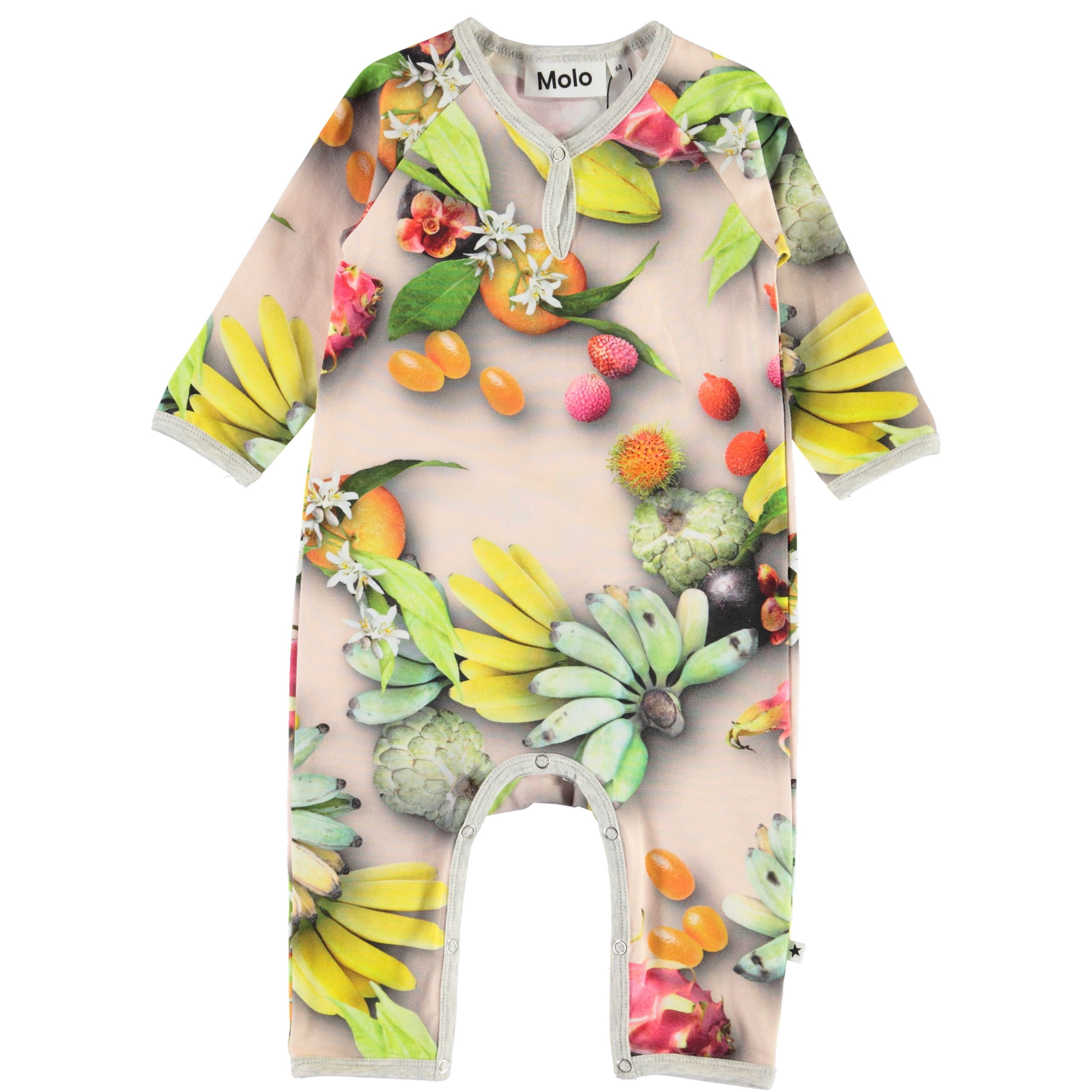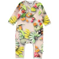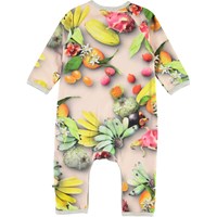 Fiona is een babypak met een print van tropische fruit. Het pak heeft lange mouwen en pijpen, een grijze biaisband en drukknopen in de nek en in het kruis.