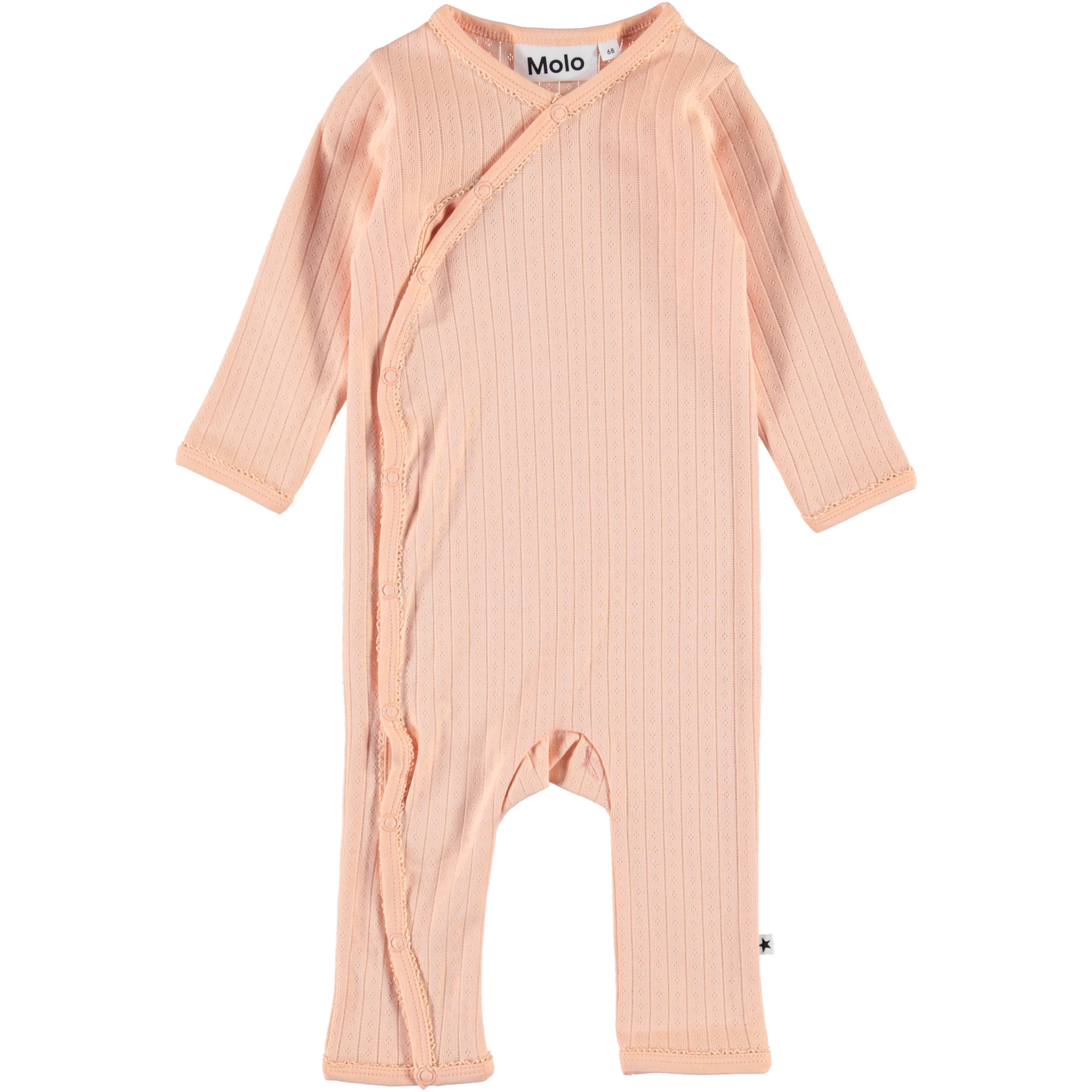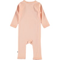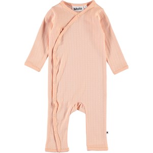 Flora is een zalmkleurige babypak in een mooi haakpatroon met lange mouwen en pijpen. De romper heeft een schuine sluiting met drukknopen aan de voorzijde en drukknopen in het kruis.