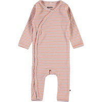 Flora is een paars, roze en rood gestreepte babypakje in een mooi naaldpatroon met lange mouwen en pijpen. Het heeft schuine drukknopen aan de voorkant en drukknopen bij het kruis.