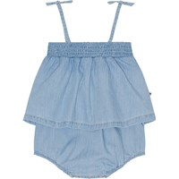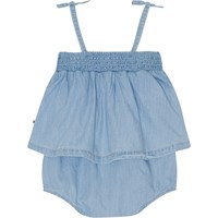 Lichtblauw zomerpakje met smalle schouderbandjes in een gewassen biologische katoen. Het pak heeft een gesmokte rand aan de bovenzijde met een ruche en drukknopen in het kruis. Omdat het pakje luchtig en wijd is en bovendien geen pijpen heeft, is het perfect voor warme zomerse dagen.