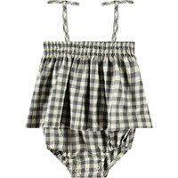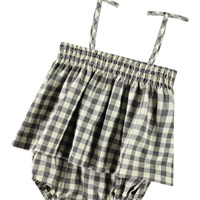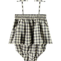 Geblokte babypakje voor de zomer van biologisch katoen. Het babypakje heeft een gegerimpeld te rand aan de bovenkant met een aangehechte ruche en drukknopen in het kruis, waardoor het makkelijk aan te trekken is. Het ruimvallende babypakje heeft dunne schouderbandjes en geen pijpen, waardoor het perfect is voor warme zomerdagen.