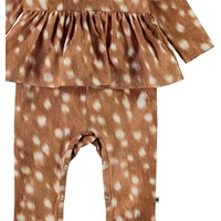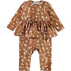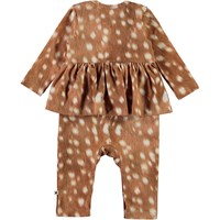 Florie is een babypakje met lange mouwen, lange pijpen en een peplum rokje. Het is in bruin met een print van witte vlekken. Het heeft drukknopen op de schouders en in het kruis.