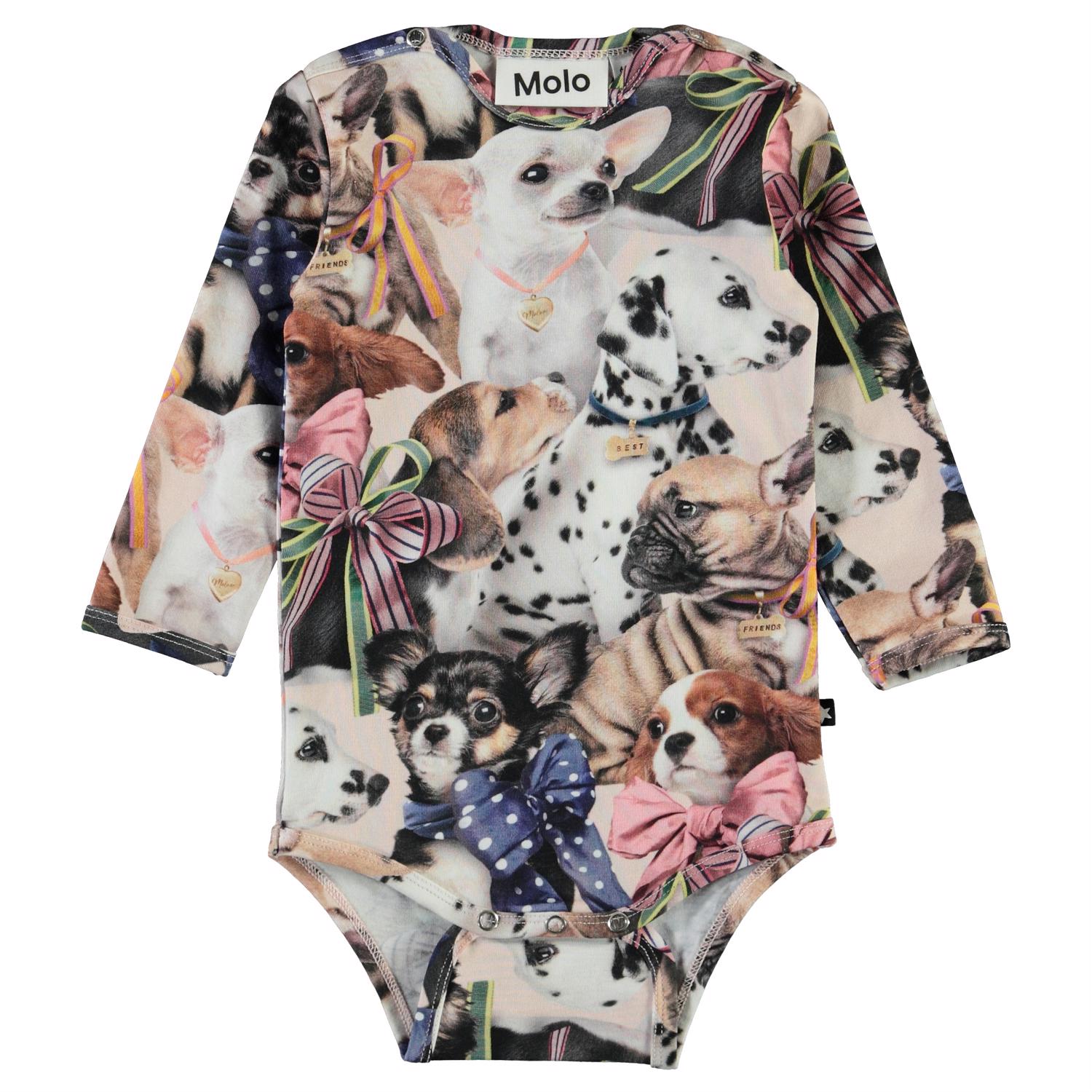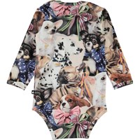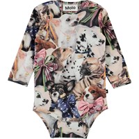 Fonda is een baby romper met een print van kleine hondjes. Het heeft drukknopen op de schouders en in het kruis.