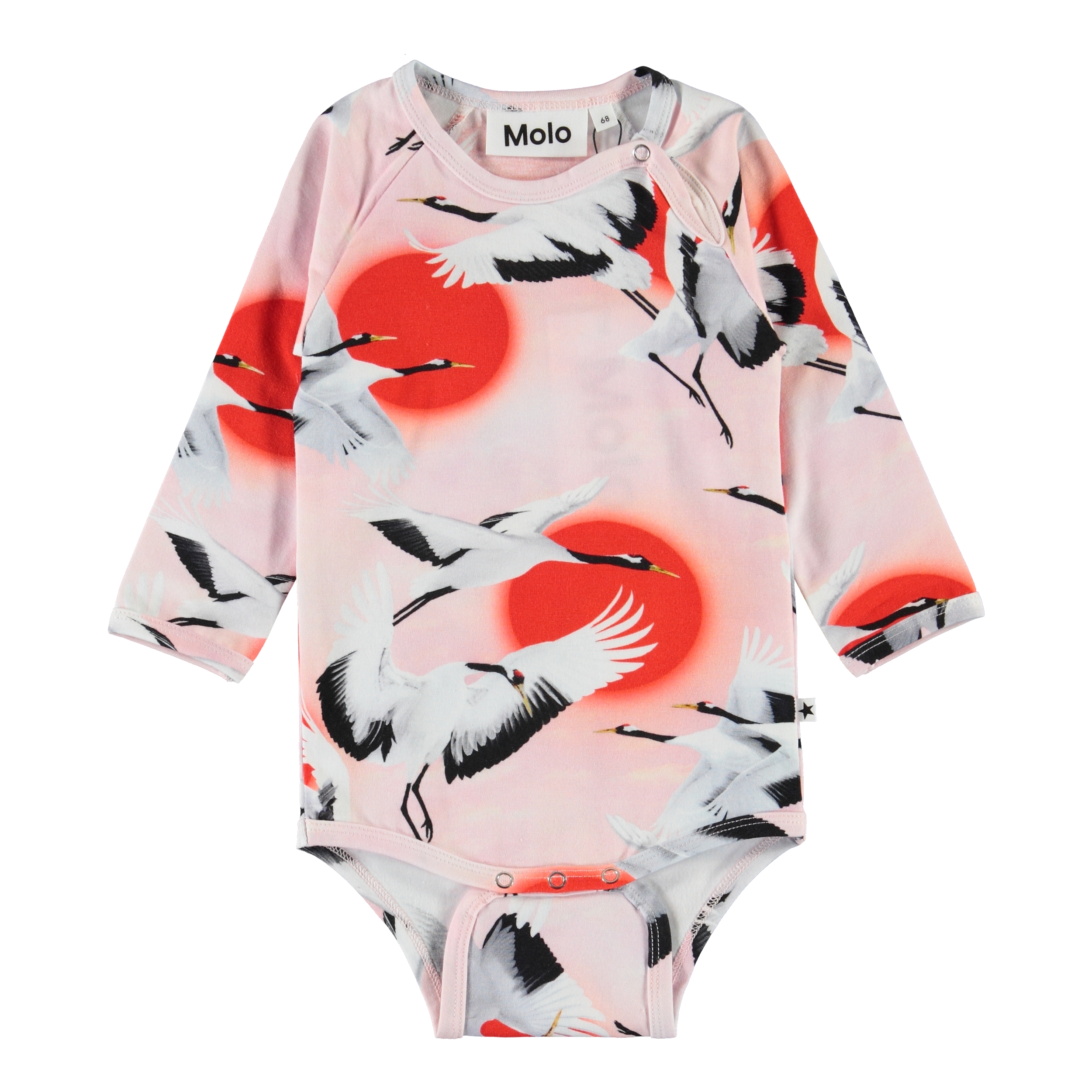 Fonda is een roze romper met lange mouwen en een print van vliegende kraanvogels. Fonda heeft drukknopen in de boord en in het kruis.