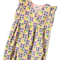 Babypakje van biologisch katoen. Het babypakje heeft korte mouwen en pijpen, ruche randen, v-hals en drukknopen aan de achterkant en in het kruis. Het is ruim en comfortabel. Het babypakje heeft een print van paarse bloemen en gele aardbeien.