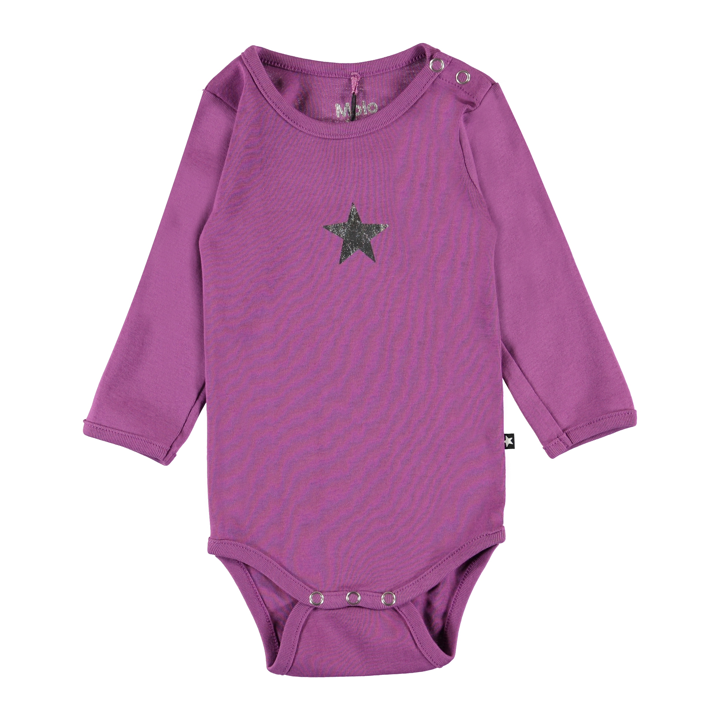 Foss is een paarse romper met lange mouwen en een ster aan de voorkant. Het heeft drukknopen in de nek en in het kruis.