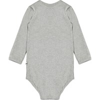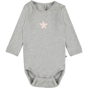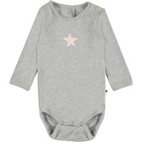 Foss is een grijze romper met lange mouwen en een ster aan de voorkant. Het heeft drukknopen in de nek en in het kruis.