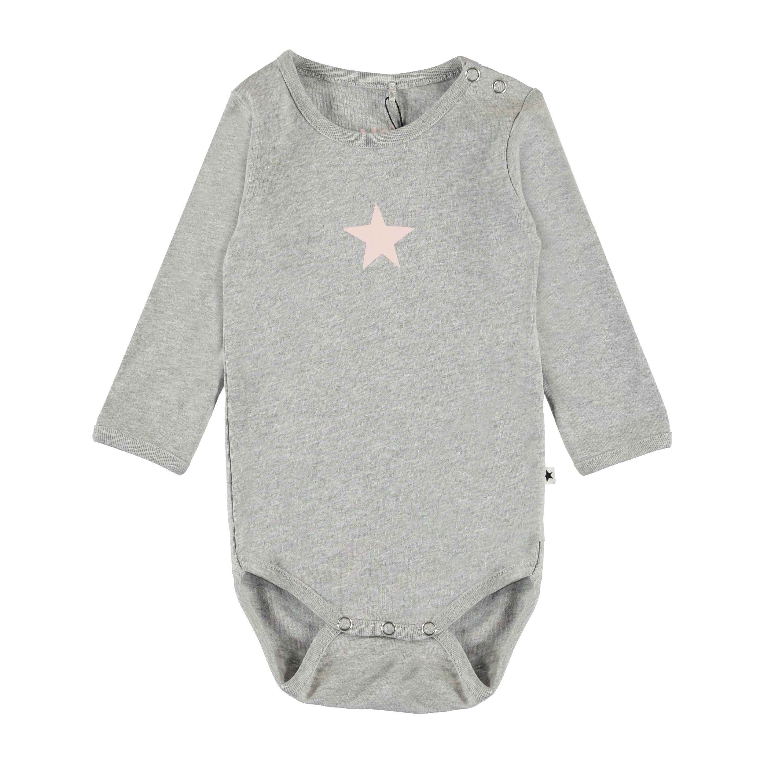 Foss is een grijze romper met lange mouwen en een ster aan de voorkant. Het heeft drukknopen in de nek en in het kruis.
