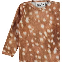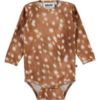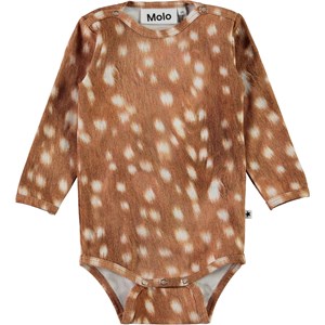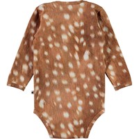 Foss is een bruin rompertje met lange mouwen en een print van witte vlekken. Het heeft drukknopen op de schouders en in het kruis.