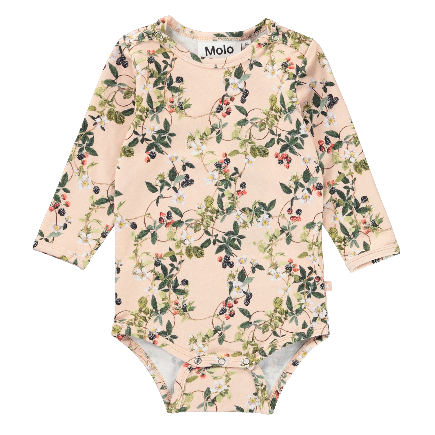 Foss is en lichtroze rompertje met een print van bramenstruiken. Foss heeft drukknopen rond de hals en in het kruis.