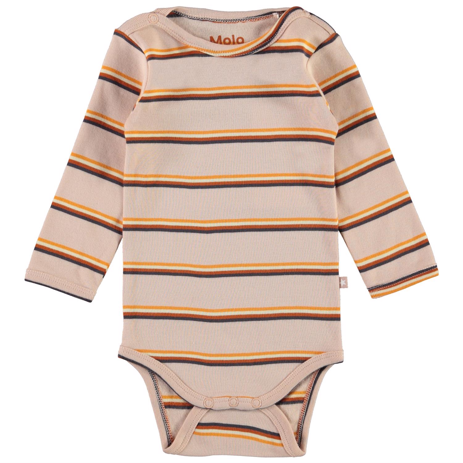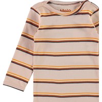 Foss is een roze rompertje met lange mouwen en smalle horizontale bruine en gele strepen. Het heeft drukknopen op de schouder en in het kruis.