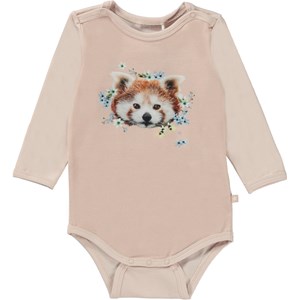 Foss is een roze rompertje met lange mouwen van 100% biologisch jersey katoen. Foss heeft drukknopen bij de schouder en in het kruis. Het heeft op de buik de schattigste rode panda omringt door bloemen.