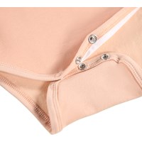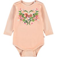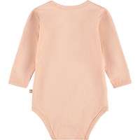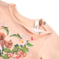 Roze rompertje voor de kleintjes gemaakt van biologisch katoen met lange mouwen en een print van een eekhoorn en planten. Het rompertje heeft een biaisband en drukknopen op de schouders en tussen de benen voor het gemakkelijk aan- en uitkleden.