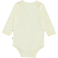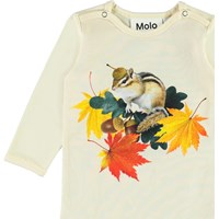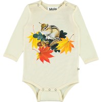 Foss is een lichtgele rompertje met lange mouwen en het heeft op de voorkant een print van een eekhoorn met gouden bladeren en nootjes. Het heeft drukknopen op de schouder en in het kruis.
