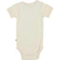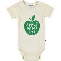 Fossie is een lichtgekleurde romper met een print van een groene appel op de voorkant. Het rompertje heeft drukknopen in het kruis.