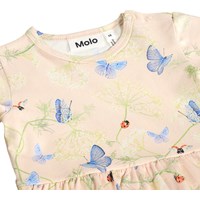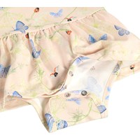 Lichtroze jurk voor de kleintjes, gemaakt van zachte, biologische katoenen jersey met een vlinderprint. Het is ontworpen met een aangehecht rompertje, dat tussen de benen sluit met drukknoopjes, zodat de jurk op zijn plaats blijft en gemakkelijk aan en uit te trekken is.