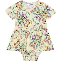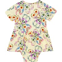 Gele rompertje met korte mouwen van elastische biologisch katoenen jersey. Het rompertje heeft een ronde hals, een peplum, witte boorden en drukknopen op de schouder en in het kruis. Het heeft een print van kleurrijke bloemen die een prachtig silhouet van klavertjes vormen.