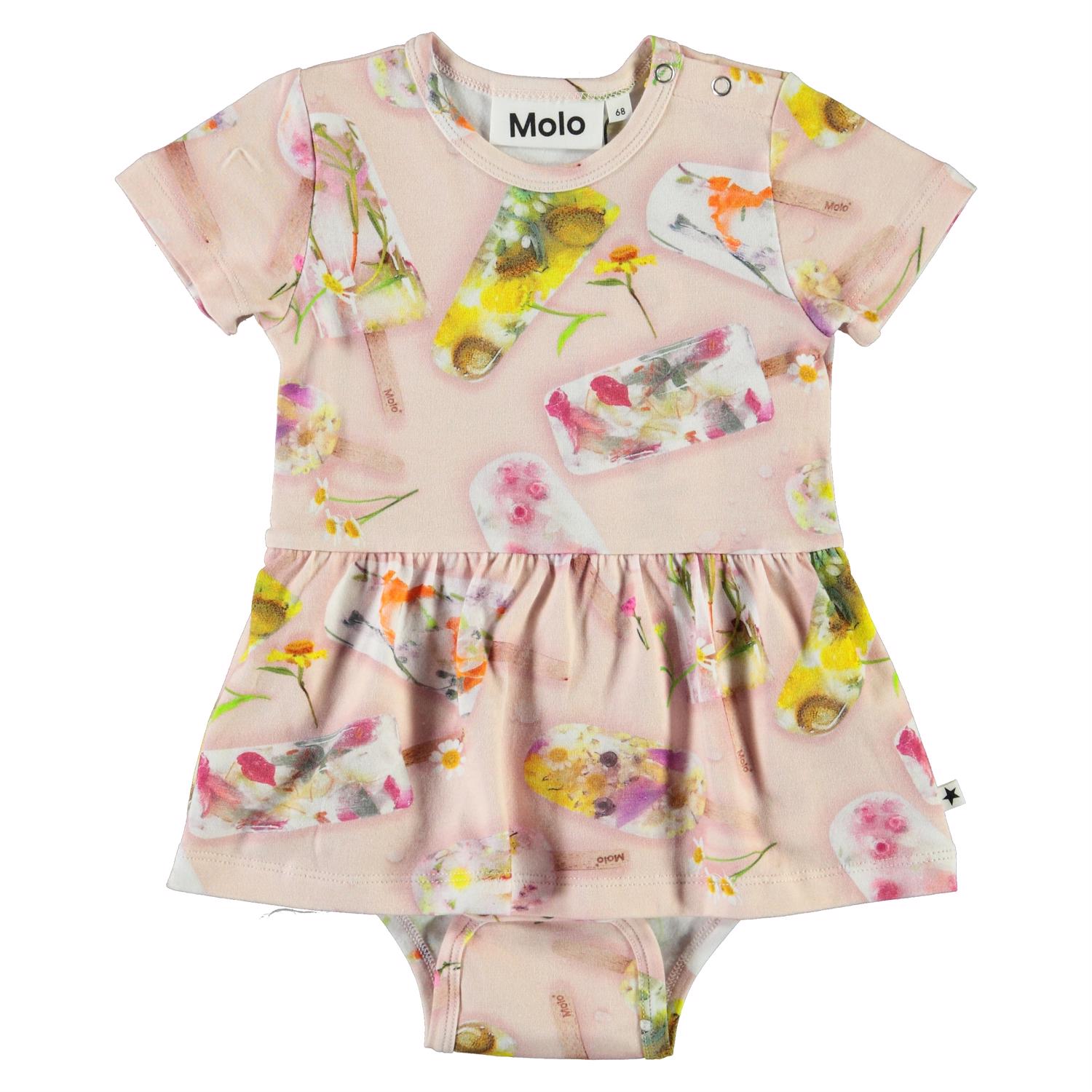 Frannie is een roze baby romper met een ijsjes print. Frannie heeft korte mouwen, een peplum en drukknopen op één schouder en in het kruis.
