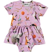 Paarse romper met korte mouw en een print van verschillende dieren die sporten. Het heeft een peplum en drukknopen bij de boord en het kruis.