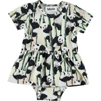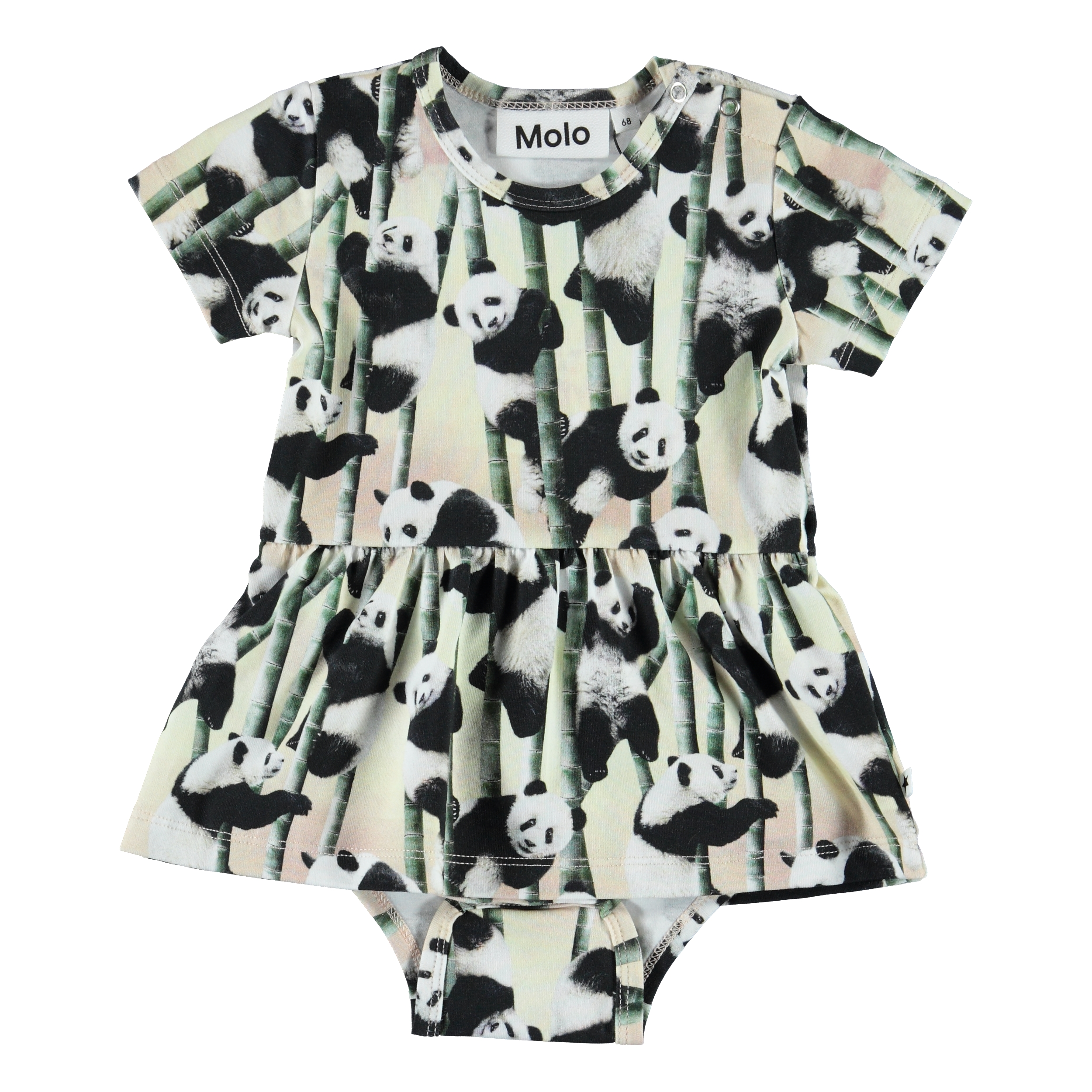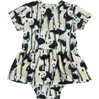 Frannie is een rompert met een print van pandaberen en hun favoriete eten: bamboe. Frannie heeft korte mouwen, een rokje en drukknopen op één schouder en in het kruis.