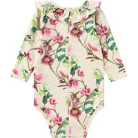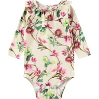 Beige rompertje van biologisch katoen met lange mouwen. Het rompertje heeft een schattige kraag en drukknopen aan de achterkant en in het kruis, waardoor het gemakkelijk aan en uit te trekken is. Het rompertje heeft een all-over print van kerstrozen in witte en lichtroze tinten, prachtig verweven met hun groene bladeren. Combineer het rompertje met de bijpassende legging voor een complete look.
