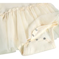 Lange mouwen, witte body voor de kleintjes gemaakt van katoenen pointelle. Het heeft babylock randen, een ruche bij de hals en een licht aangehecht rokje. Makkelijk vast te maken met drukknoopjes op de schouders en tussen de benen.