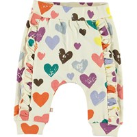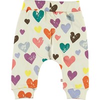 Safira is een baby joggingbroek gevuld met liefde in de vorm van veelkleurige hartjes. Het heeft ruches aan de voorkant van de pijpen en elastische ribboord in de taille en aan de pijpen.