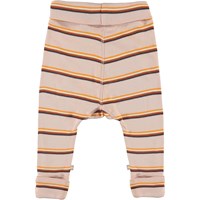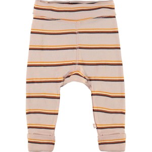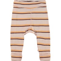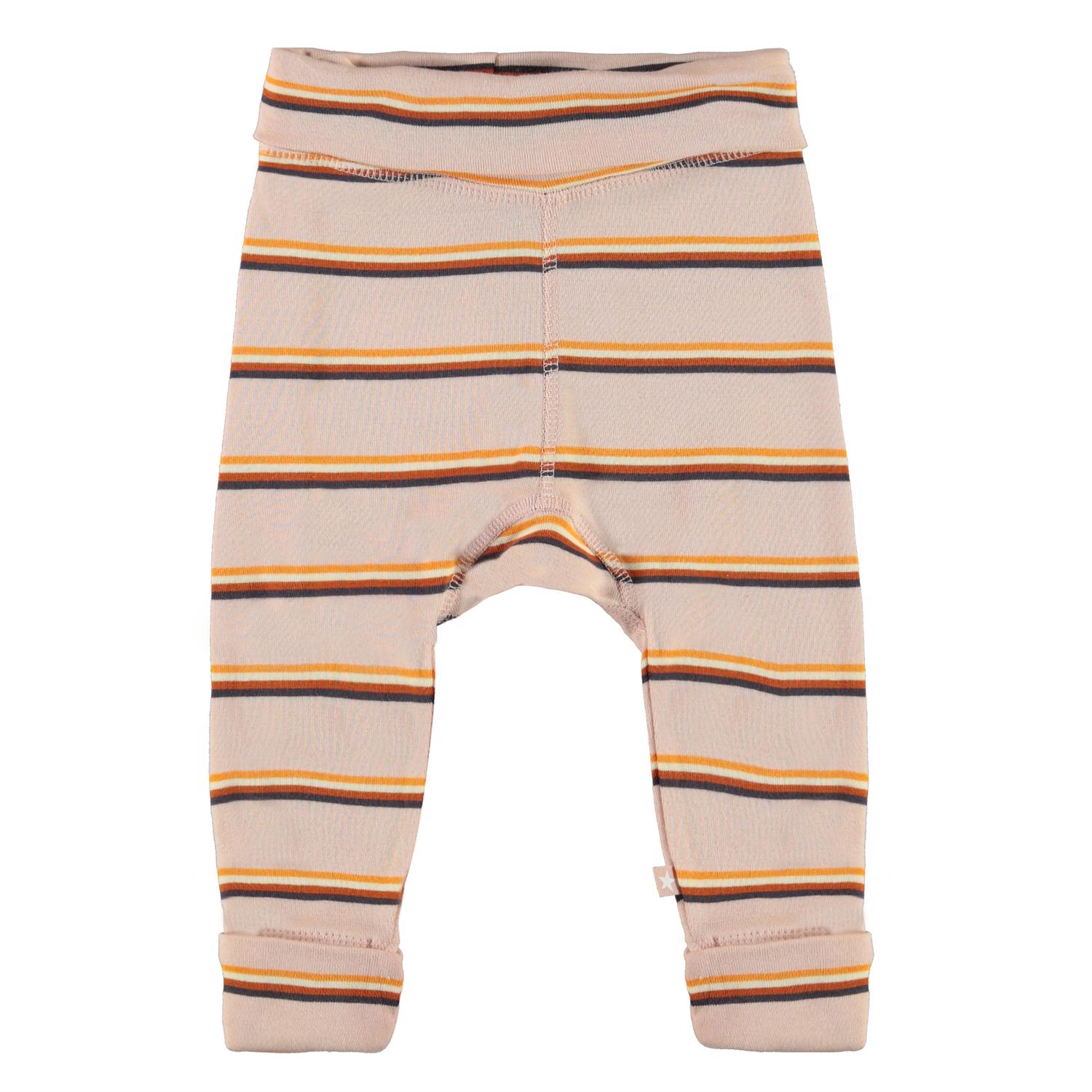 San is een roze babybroek met smalle strepen. Het heeft breed elastiek bij de omgeslagen taille en de opgerolde pijpen.