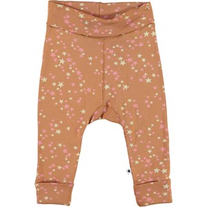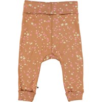 San is een bruine babybroek met sterrenprint. Het heeft breed elastiek bij de omgeslagen taille en de opgerolde pijpen.