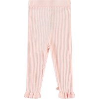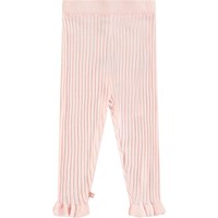 Roze gebreide broek in zachte rib. De broek heeft een elastische taille en mooie ruche randen aan de pijpen. Voor een complete outfit combineer je het met een bijpassend vest.