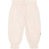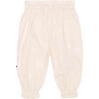 Voor kleine kinderen een gebroken witte jersey broekje van een zacht biologisch katoen. Het heeft een ruimvallende pasvorm en is voorzien van elastiek bij de pijpen en taille, waardoor het extra volume krijgt en er een ruche ontstaat bij de pijpen Het is comfortabel en wordt in de taille geknoopt met een koordje.