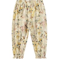 Lichtgele broek van biologisch katoenen jersey voor baby's en peuters. De broek heeft een rib tailleband en elastiek rond de enkels, wat zorgt voor schattig ruches. Het heeft een kleurrijke print van schattige aquarel geschilderde poezen in grijze, gele en lichte tinten.