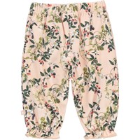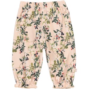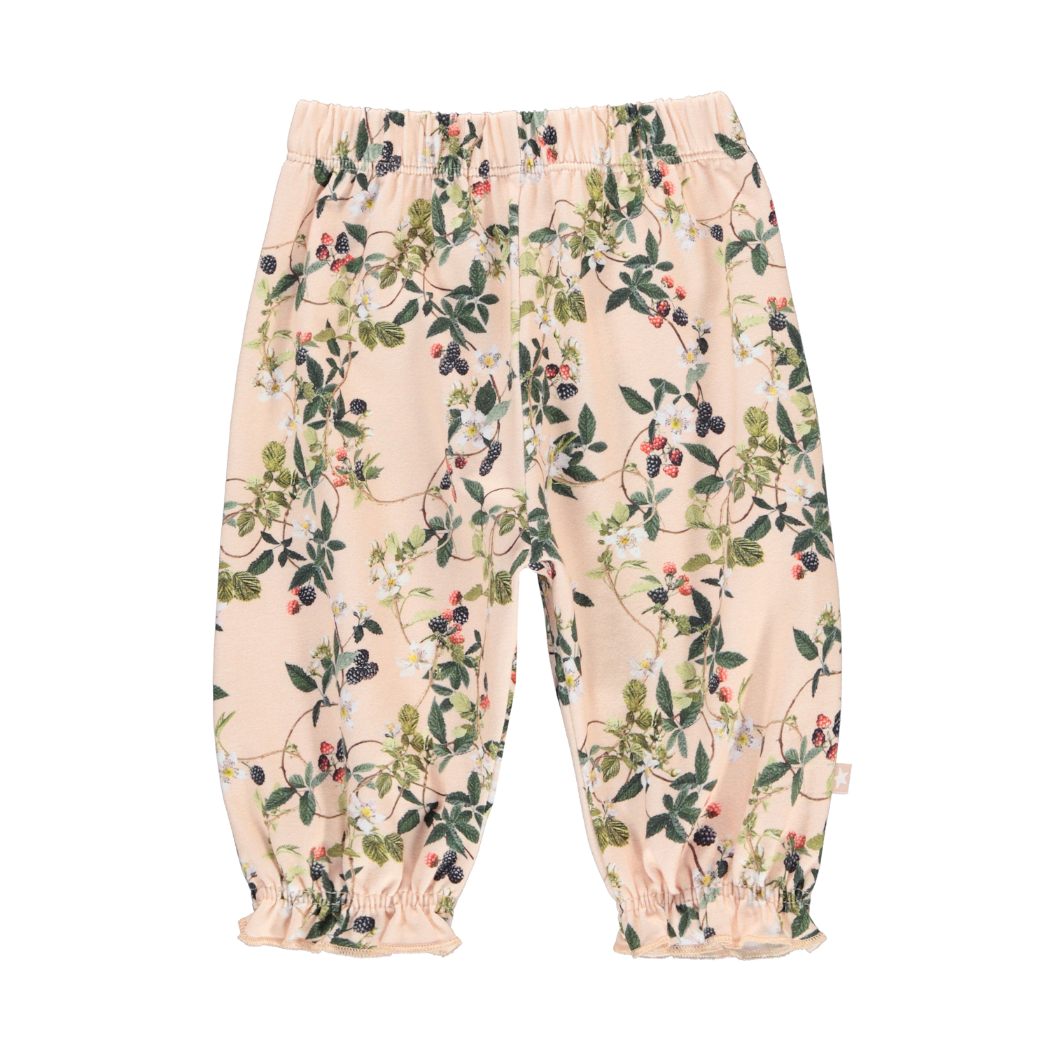 Selena is een lichtroze babybroek met een print van bramenstruiken. Het heeft een elastische boord rond de taille en pijpen.