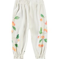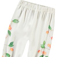 Broek van biologisch katoenen jersey voor de kleintjes. De broek heeft elastiek in de taille en enkels, waardoor er een schattig ruche ontstaat. Het is wit met een kersenprint langs de pijpen.