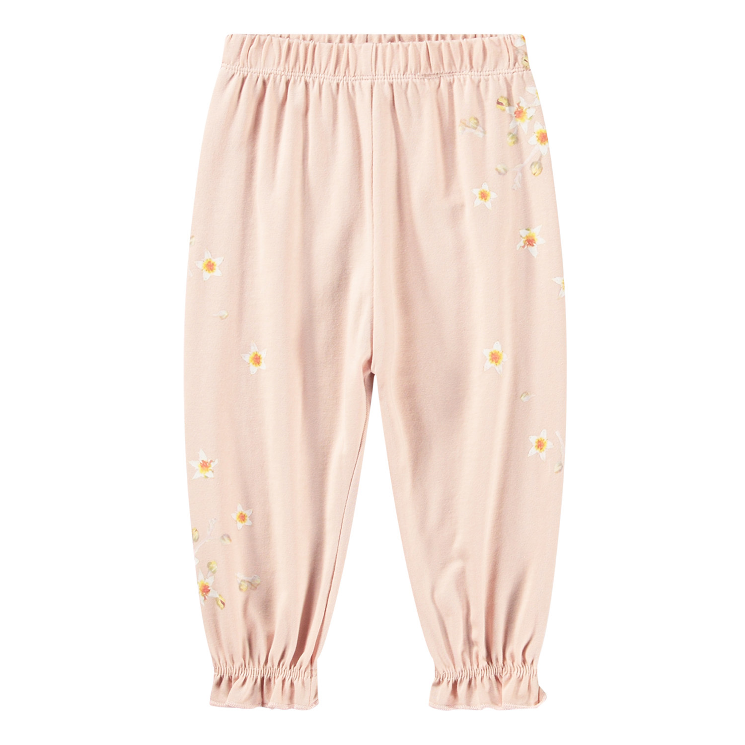 Roze joggingbroek van biologisch katoen voor baby's en peuters. De broek heeft een geribbelde tailleband en elastiek rond de pijpen, wat zorgt voor schattig ruches. Op de broek staat een print van kleine prachtige witte bloemen.