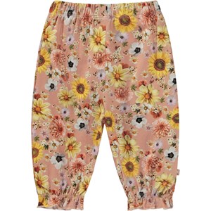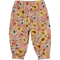 Roze babybroek met bloemenprint. Het heeft elastiek in de taille en pijpen met een gerimpeld effect.