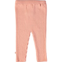 Zalmkleurige wollen babybroek in ribstof en aantrekkoord in de taille.