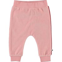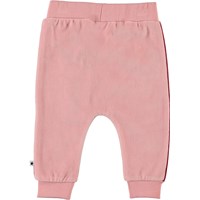 Shona is een roze baby joggingbroek van fluweel met rode biezen aan de zijkant. Het heeft een elastische boord rond de taille en pijpen.