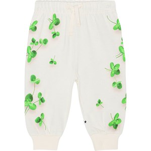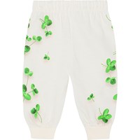 Voor kleine kinderen een gebroken witte joggingbroek van biologisch katoen. Het heeft elastiek en een koordje in de taille en ribboord rond de pijpen. Het is gemakkelijk aan te trekken en je kan je er gemakkelijk in verplaatsen. De joggingbroek heeft een print van prachtige groene klavertjes aan de zijkant van beide broekspijpen.