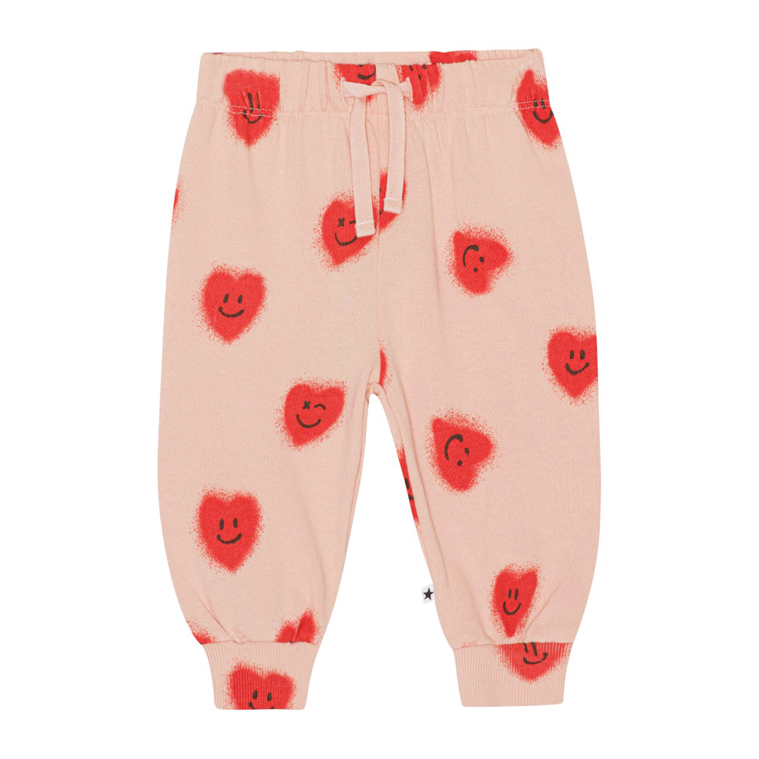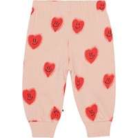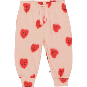 Voor kleine kinderen een roze gekleurde joggingbroek van biologisch katoen. Het heeft elastiek en een koordje in de taille en rib bij de pijpen. Het is gemakkelijk aan te trekken en je kan je er gemakkelijk in verplaatsen. De joggingbroek heeft een lieve print van rode gespoten hartjes met lachende gezichtjes. Deze stijl kan als set worden gekocht met de bijpassende trui.
