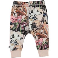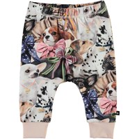 Simone is een babybroek met een print van kleine honden met strikjes om hun nek. Het heeft elastiek in de taille en grijze elastische boorden aan de pijpen.