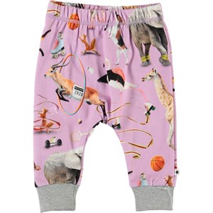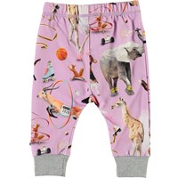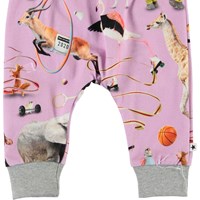 Simone is een paarse babybroek met een print van verschillende dieren die sporten. Het heeft een elastische boord rond de taille en een grijze elastische boord aan de pijpen.