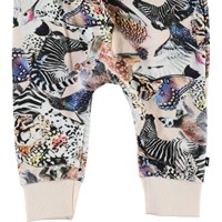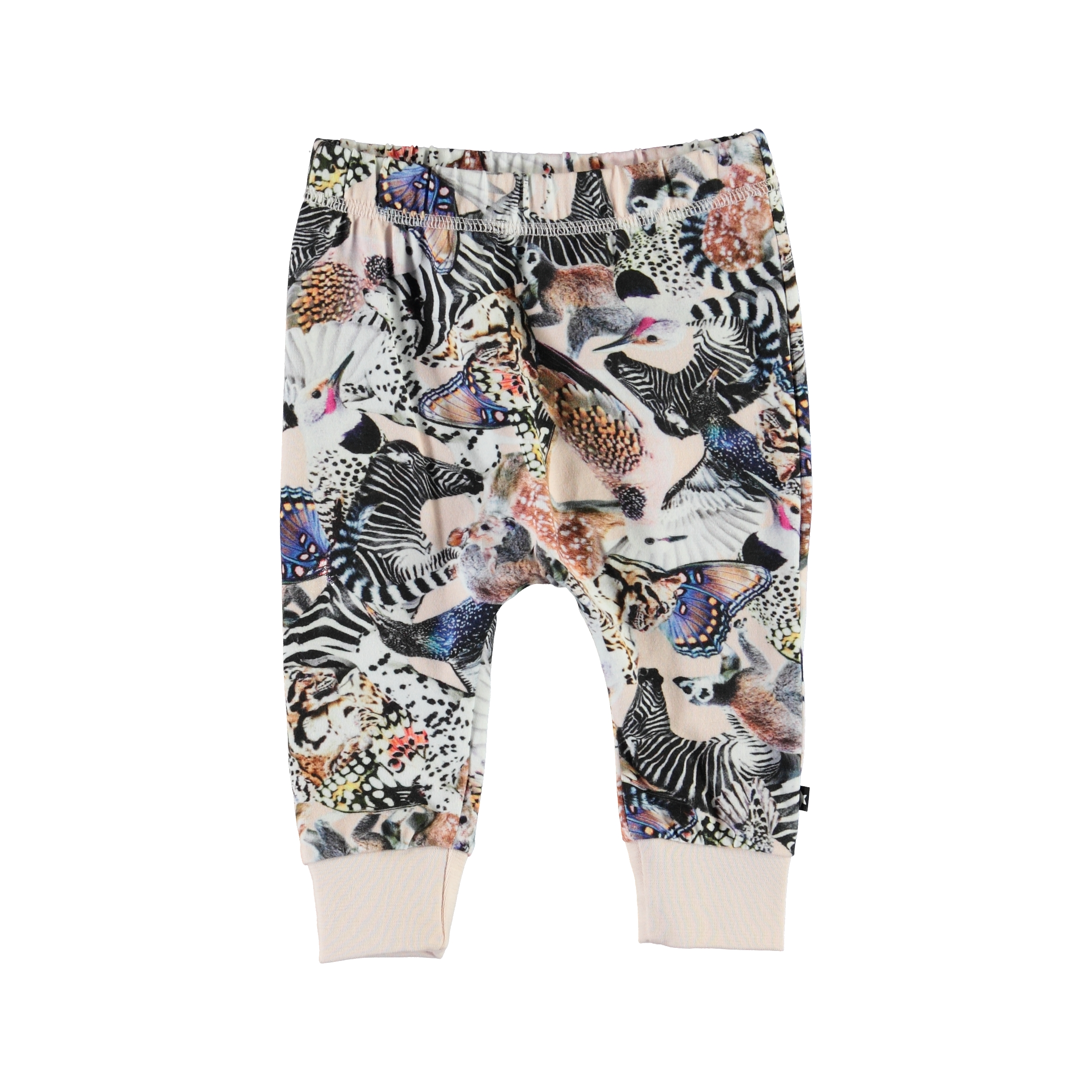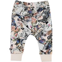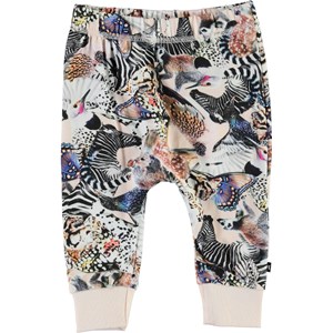Simone is een babybroek met een print van verschillende dieren die samen een cool patroon vormen. Het heeft een elastische boord rond de taille en een grijze elastische boord aan de pijpen.