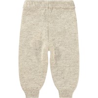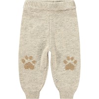 Deze gebreide broek is perfect voor baby's en peuters met hun lichtbeige gemêleerde kleur en zachte wolmix. De broek heeft rib rond de taille en de pijpen, wat zorgt voor een comfortabele pasvorm. Daarnaast heeft het ook kleine bruine pootafdrukken op de knieën, wat een schattige en speelse touch toevoegt.