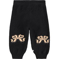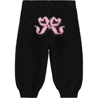 Zwarte wollen broek voor de kleintjes. De broek heeft strikjes op de knieën en aan de achterkant. Het heeft elastische boorden rond de taille en pijpen en wijde pijpen. Combineer het met de bijpassende sweater.