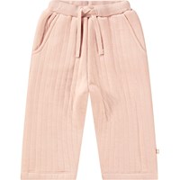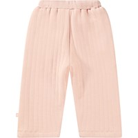 Roze gewatteerde broeken van zacht katoen voor de baby's en peuters. De broek heeft een elastische tailleband en een koordje, evenals zakken aan de zijkanten. het heeft ook wijde pijpen.
