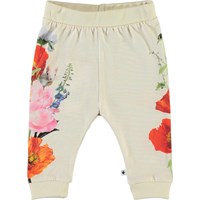Susanne is een beige babybroek met een print van dieren en bloemen aan de zijkant van de pijpen. Simone heeft een elastische tailleband en ribboord aan de pijpen voor een comfortabele pasvorm.