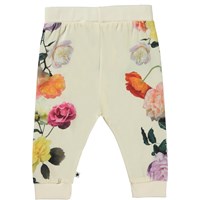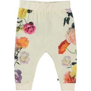 Susanne is een lichtgele babybroek met op de pijpen een print van verschillende soorten rozen. De broek heeft elastiek rond de taille en de enkels. Het is gemaakt van 100% biologisch jersey katoen