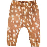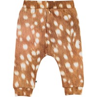 Susannen is een ruime bruine babybroek met print van witte vlekken. Susannen heeft een elastische tailleband en ribboord aan de pijpen voor een comfortabele pasvorm.
