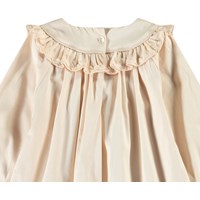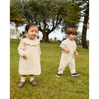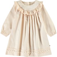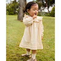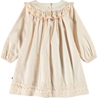 Beige jurkje van biologisch katoen voor de kleintjes. De jurk heeft ruches rond de kraag, knoopsluiting aan de achterkant, slanke ballonmouwen en details aan de onderkant.